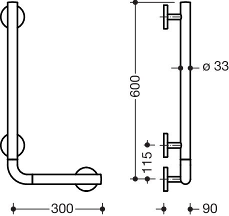 HEWI Winkelgriff, AM:600mm W:300mm d:33 mm, Kst., chromoptisch beschichtet