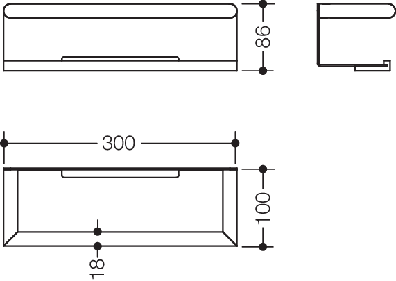 - 300 mm breit, 86 mm hoch und 100 mm