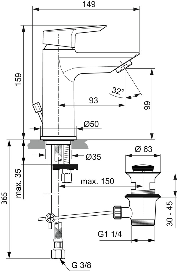 Einhand-Waschtischbatterie TESI 5l/min. m.Ablaufgarn.Ausl.93mm chrom IS