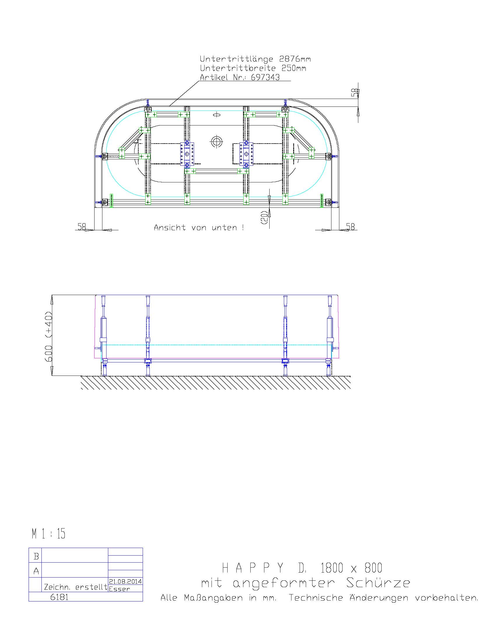 Badewanne Acryl Happy D.180x80cm m.Schürze u.Gestell weiss Hoesch