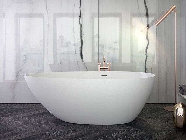 Mit ihrer unvergleichlich weich gerundeten, ovalen Formgebung versprüht die Badewanne Grace von Knief eine exklusive Eleganz und wird zum Blickfang in jedem Badezimmer. Das freistehende Modell allein bietet wahren Luxus und lässt pures Wellness-Feeling aufkommen. Gefertigt ist die Wanne aus herrlichem weichem K|Stone. Dieser naturähnliche Mineralwerkstoff wurde eigens von Knief entwickelt und bietet besonders hygienische sowie schmutzabweisende Eigenschaften.