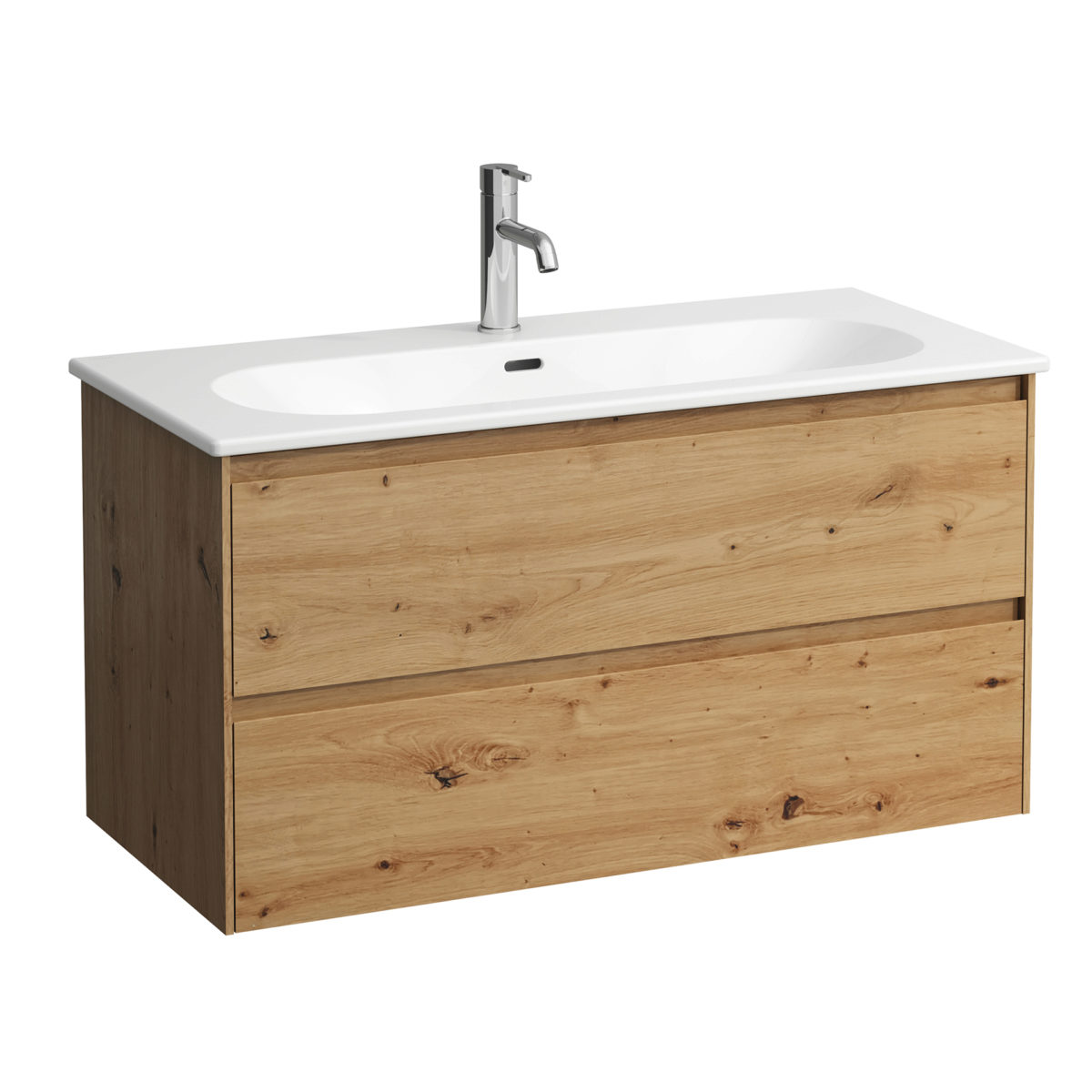 Bestens aufeinander abgestimmt: Der extrabreite Laufen Waschtisch Lua präsentiert sich hier in Kombination mit einem geräumigen Unterschrank, welcher mit seinen zwei Schubkästen ausreichend Stauraum für sämtliche Badutensilien bietet. In verschiedenen Ausführungen erhältlich.