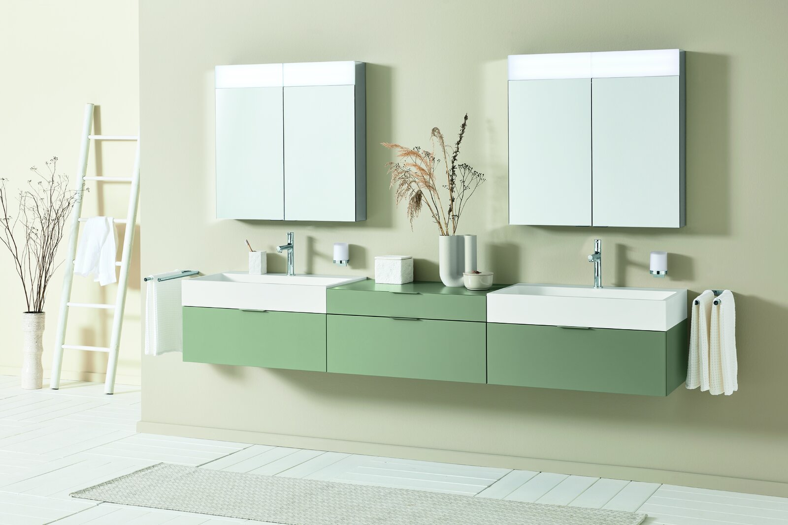 Der zweitürige Spiegelschrank white V4 von VIGOUR besticht mit seinem glasklaren, edel puristischen Design und dem cleveren Stauraum in Inneren. Optisch aufs Wesentliche reduziert, erfüllen die unterhalb positionierte Steckdose und das LED-Lichtband oben praktische Aspekte. Auf den Glaseinlegeböden stehen Ihre Badutensilien stets griffbereit.