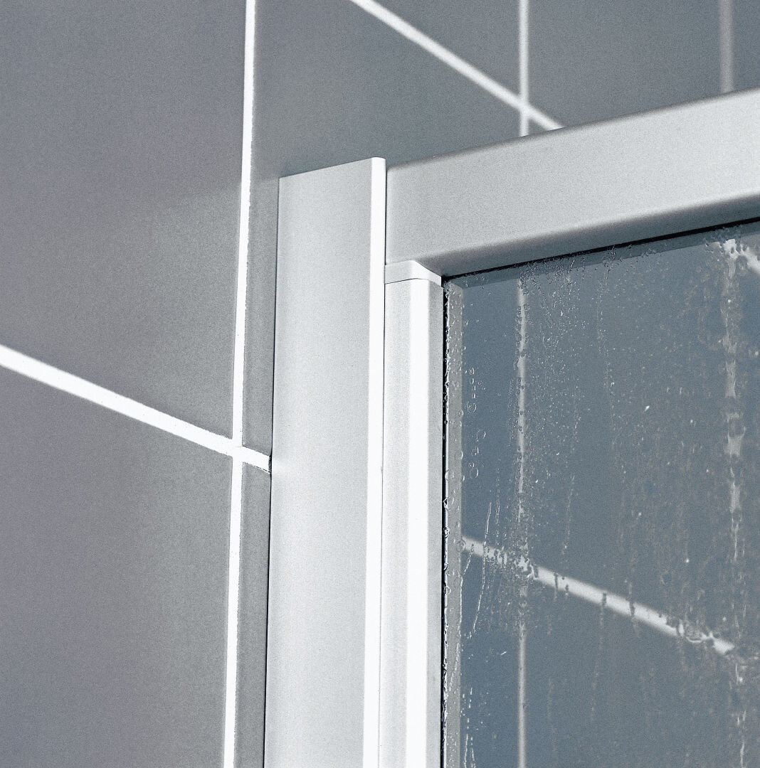 Die gerahmten Gleittürsegmente erhalten Sie in verschiedenen Breiten und können Ihre persönliche Eckdusche individuell gestalten. Die Rahmenfarbe der eleganten Duschlösung erhalten sie in hochwertig eloxiertem mattem Aluminium oder klassischem Weiß.