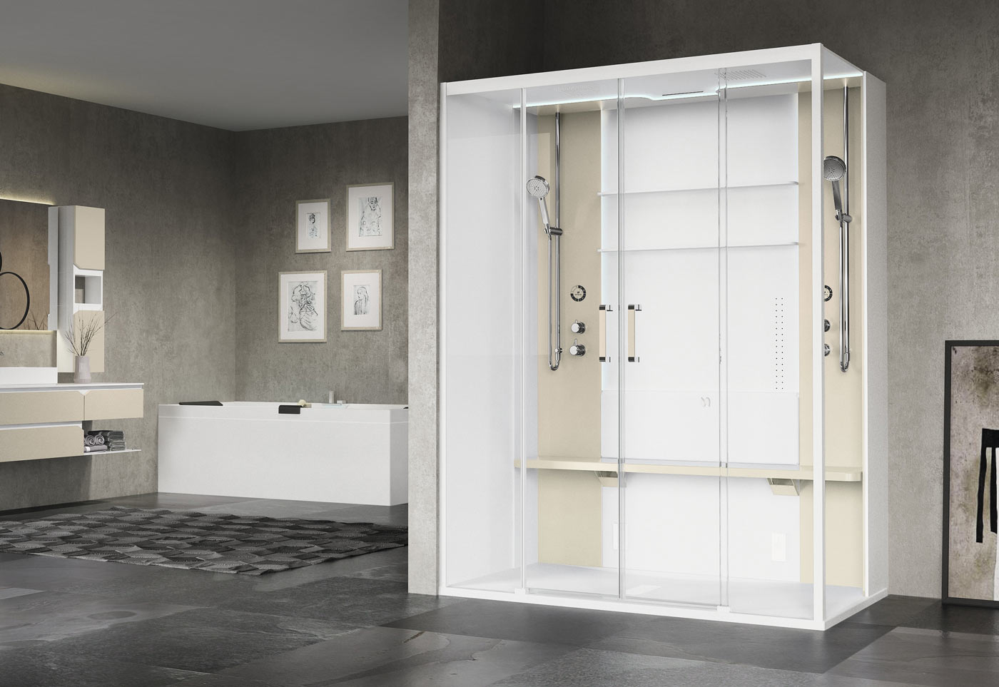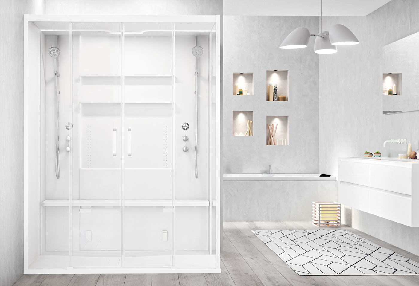 Mit der Multifunktionskabine Skill von Novellini können Sie dem Alltag perfekt entfliehen und Ihre Kräfte regenerieren, denn als komplette Wellnesslösung bieten Skill alles Notwendige für das Wellness-Programm im eigenen Heim: eine Duschabtrennung mit je zwei Gleittüren und Festteilen zur Eckmontage, Klappsitz und Ablage sowie dem Thermostat mit Wasserfalldusche und Handbrause. Per elektronischem Bedienpaneel können Sie zudem ganz bequem stimmungsvolles LED-Chromolight, das Dampfbad und die Rückenmassagedüsen einstellen – für Entspannung auf Knopfdruck. Die herausragenden Innovationen zeigen sich jedoch auch im Äußeren: Die Dampfkabine Skill aus dem Hause Novellini trumpft hier nämlich mit betont schlichtem, einfach gestaltetem Design auf. So gliedert sie sich mühelos in die ästhetische, moderne Badgestaltung ein.